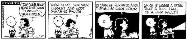 Faults part 8; Luucy starts showing Chuck his terrible color-coded slides and he wonders which color is worse, green, blue or pink.