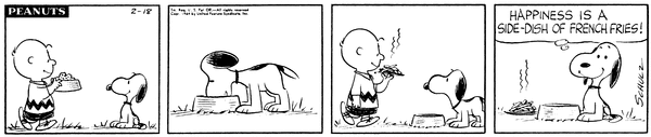 Charlie Brown delivers the Snoopy Scavengers an extra side of fries to their regular delivery and they say happiness is a side-dish of fries.