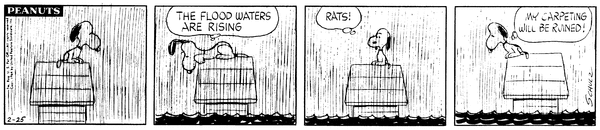 Rain part 3; Snoop notices the water getting higher and wonders if he should swim for safety but is worried it will offend the humane society.