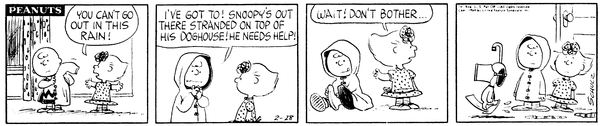 Rain part 4; Chuck and Sallicia talk about the rain and then he realizes that Snoopy is trapped on his house as he prepares to swim back.