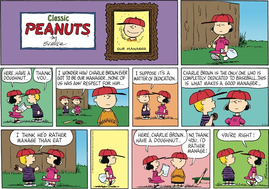 Mr. Manager part 250; Luc gives Schroed and the rest of the team doughnuts and wonders how Chuckson got to be manager, and they decide that he is dedicated, he is then offered a doughnut but he refuses it so he can manage.623
