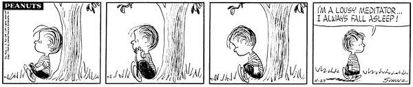 Lins tries to meditate by a tree but falls asleep and decides he can't meditate because he always falls asleep.