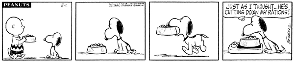 Charlie Brown brings food to the Snoopy Scavengers but they check inventory and realize that the shipments are decreasing.