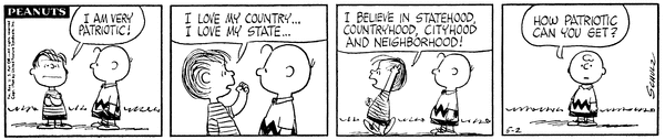 Lins brags to Chuck about his patriotism to his nation-group, country, city and neighborhood and he wonders if anyone is more patriotic.