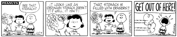Eraserophagia part 6; Luucy shows Chuc's stomach to Fried and informs her that it is filled with erasers and so he yells at them to go away.