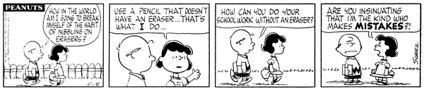 Eraserophagia part 5; Chuc wonders how he can break his eraser nibbling habit and Luucy tells him to not use erasers, he wonders how she works but she asks if he is insinuating that she makes mistakes.