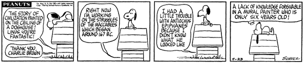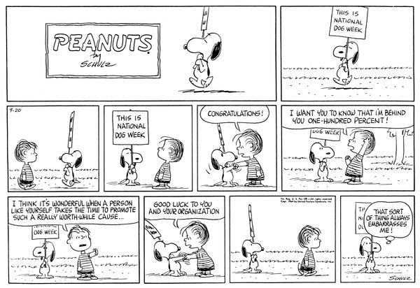 Snoopy puts up several signs to celebrate UNOP Doge week and Lins sees one of the Peanutsville signs and praises UNOP Doge week which embarrasses the person running the sign.