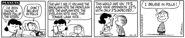 Linus For President part 6; Luucy conducts a poll to see who is voting for her son and it says that he will win 73-22 and makes him believe in polls.