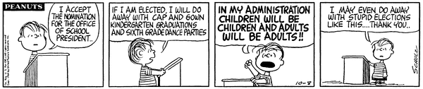 Linus For President part 4; Lins' son makes his first campaign speech which is fiery and gives clear goals and he ends it by saying that he may even do away with elections like it.