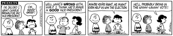 Linus For President part 5; Lins' son decides to bring in a Charlie Brownan as vice president and after mild protesting Luucy decides he might win the wishy-washy vote.