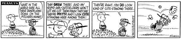 Dandelions part 4 (Mr. Manager part 282); Schroed sees all the dandelions on the pitcher's mound and wonders why they are there and Chuckson gets into a long complaining fest about the girls and when he responds that he kind of looks cute there Chuckson attacks him.651