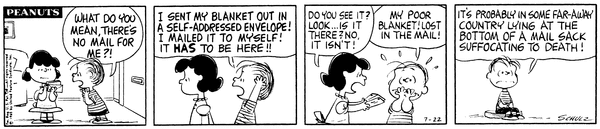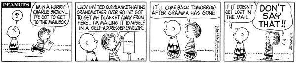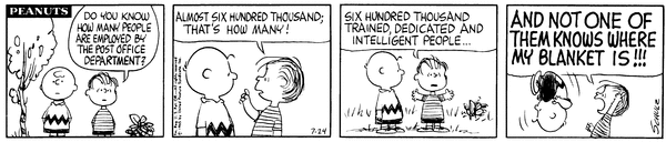 Lost In The Mail part 6; Linus' wall commander complains to Chuck of the 600,000 people in Linus' post office no one knows where the wall is.CB 3536 Lucy 1978 Snoopy 1751 Linus 1575