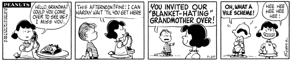 Lost In The Mail part 2 (Blanket Hating Grandmother part 17); Lu calls a secretary of the BHG executive asking for some attention to the Van Pelts so that the wall can be taken away.