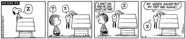 Lins walks up to Snoop sleeping on the Doghouse, his feet holding on but his head leaning down which he has no clue how it is possible but Snoop later says that his head is asleep but his feet are awake.